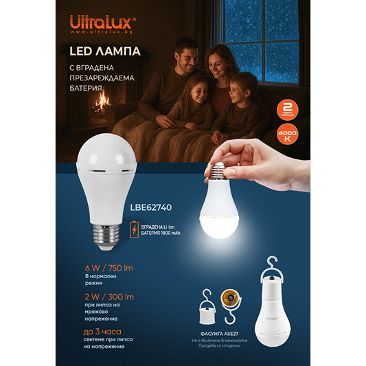 LED лампа крушка с вградена батерия 6W, E27, 4000K, 220-240V AC, неутрална светлина/LBE62740