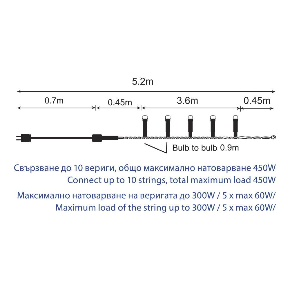 Веригата за външно осветление SWING 5xE27 IP44 може да превърне всяка осветявана с нея градина, тераса или веранда в красиво и уютно място за вечеря, релакс или забавление. Светлинният източник не е включен в комплекта. SWING 5xE27 е снабдена с 5 фасунги за лампи Е27, степен на защита IP44 и възможност за максимално натоварване до 5 х 60W.