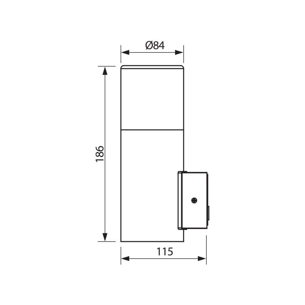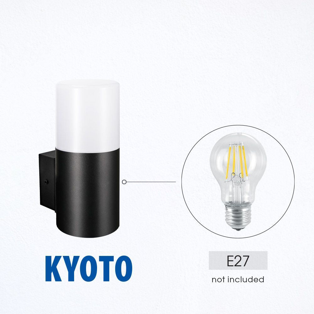 Цилиндричният конус на външните осветителни тела от серията KYOTO предлага универсална възможност за осветяване на пространства пред сгради с различно предназначение. Още по-голяма гъвкавост се постига с фасунгите на E27, в която могат да се ползват лампи с различна мощност и цветна температура. Фасадно осветително тяло с цилиндрична форма - основа с черен цвят и бял разсейвател, 1 х Е27, максимум 40W, височина 186 мм, степен на защита IP44.