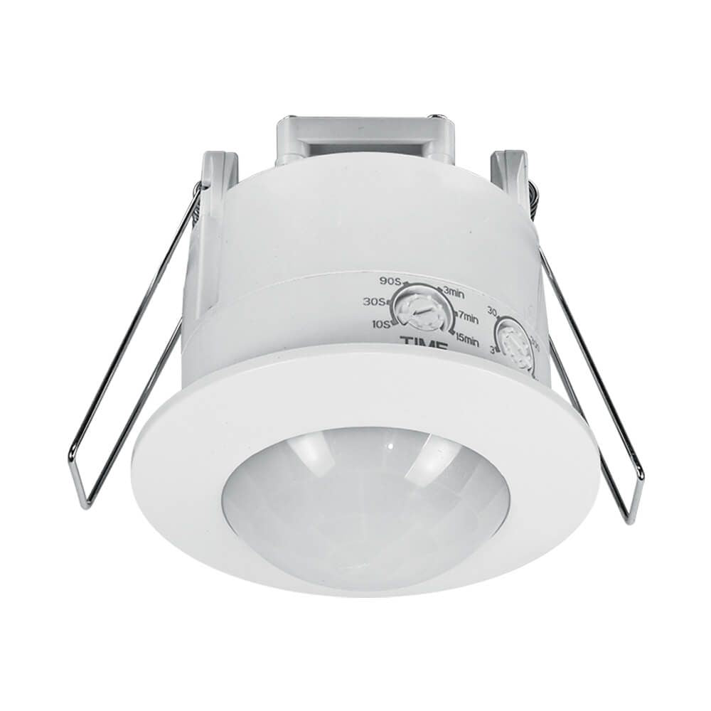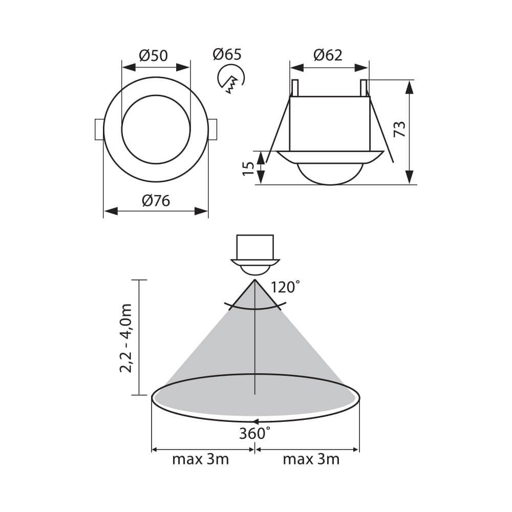 Стационарен сензор за монтаж на таван, бял. MOON е предназначен за монтиране в отвор с диаметър 65 мм в окачен таван. Обхват на действие - 360 градуса. Максимално разстояние на действие до 3 m. Максимално управлявано натоварване 1200W. Степен на прахо- и влагозащита - IP20.