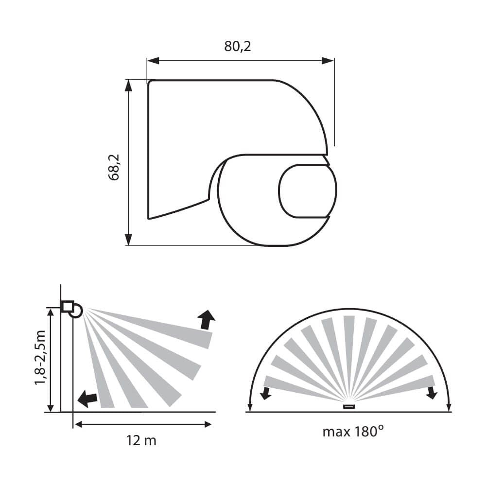Инфрачервен сензор, max 400W LED, 180°, бял, 230V. Инфрачервеният сензор е с обхват на действие 180° и максимално разстояние на действие 12 m. Степен на прахо- и влагозащита - IP44.