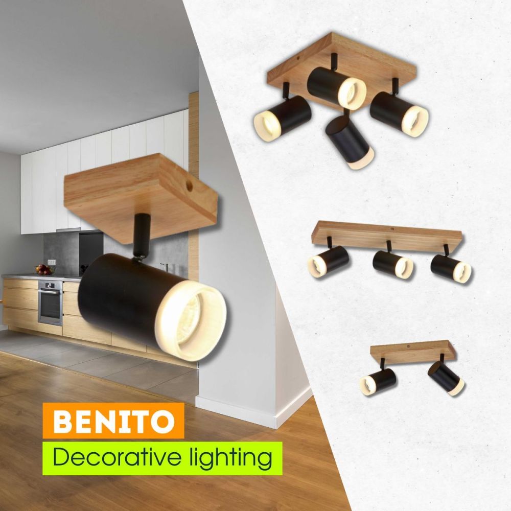 Серията BENITO съдържа тела с подвижни спотове и полилеи за лампи с цокъл GU10. Естественото дърво и метал в черен цвят на корпуса на телата се допълват от деликатен акрилен ринг, който създава усещане за повече светлина, когато лампите работят.