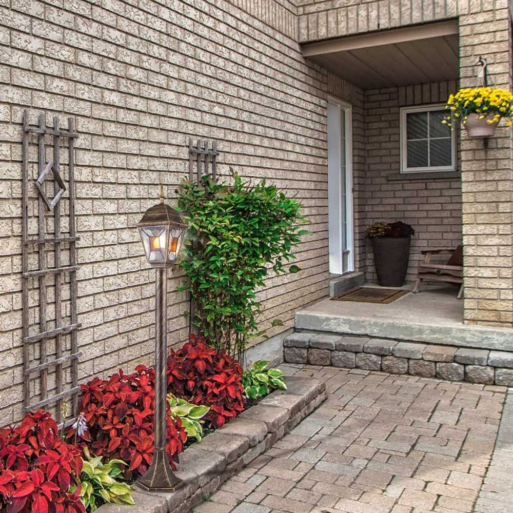 Фенер, цвят античен месинг, за монтаж върху земя в комплект със стълб, алуминиев корпус, декоративно стъкло тип "витраж", фасунгата E27, IP44, обща височина 1000 мм. Максимално натоварване 1 х 60W за лампи с нажежаема жичка. Серията класически фенери MURANO се състои от фенери с четиристенен алуминиев корпус в цвят античен месинг и стъкло от 5 части с декоративен елемент. Фенерите са влагозащитени с IP44 и са подходящи за лампи с цокъл Е27.
