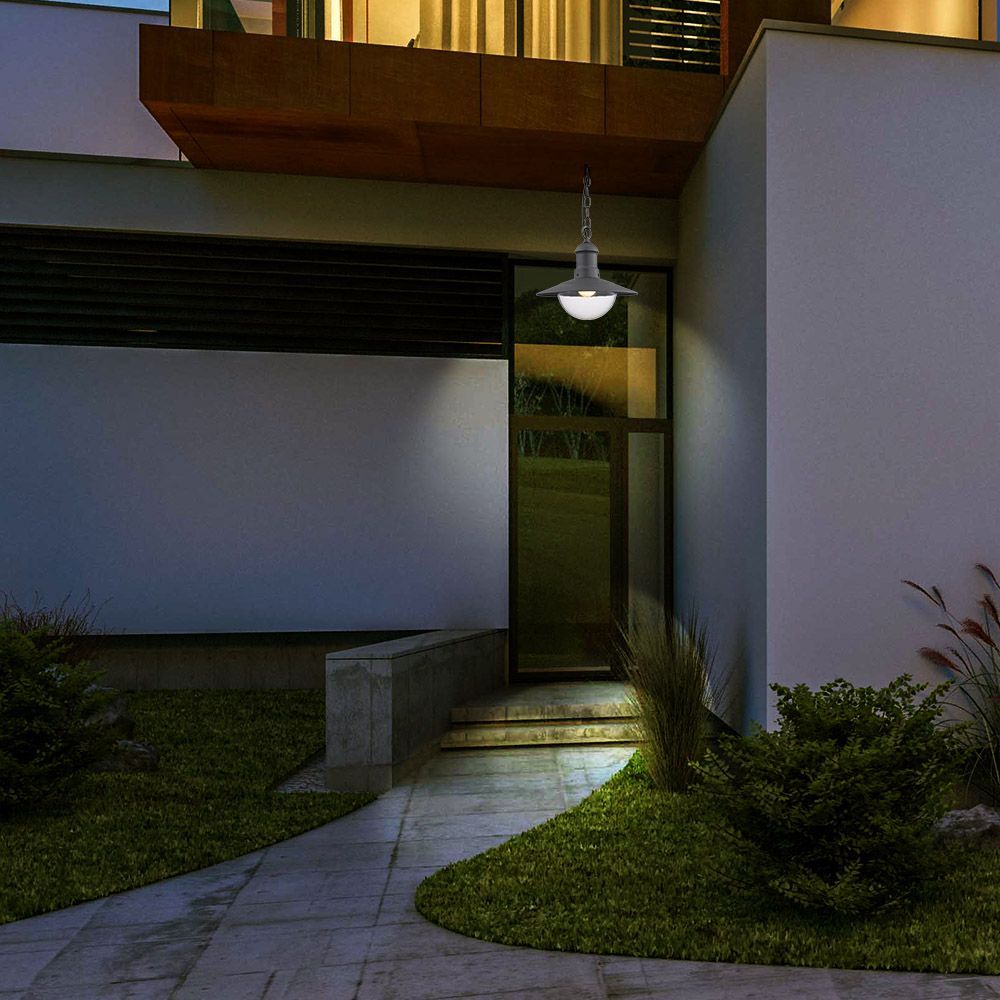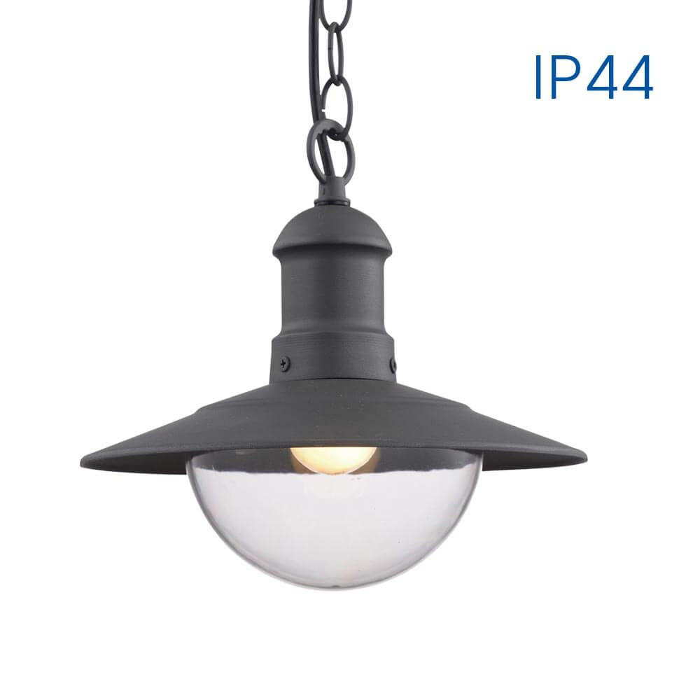 Висящ градински фенер RIVIERA, H010/GR, 230V, тъмно сив. Серията фенери RIVIERA са с дизайн в средиземноморски стил и се предлага в три цвята на корпуса: бяло със злато, тъмносиво и античен месинг. Моделите в серията са с възможност за монтаж на стена или за окачване и са съвместими с лампи с цокъл Е27.