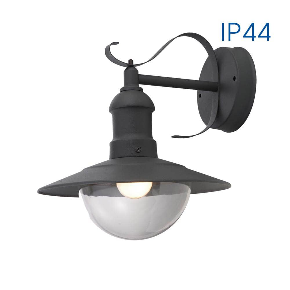 Стенен фенер с горен носач RIVIERA WD010/WH IP44, 230V, бял. Серията фенери RIVIERA са с дизайн в средиземноморски стил и се предлага в три цвята на корпуса: бяло със злато, тъмносиво и античен месинг. Моделите в серията са с възможност за монтаж на стена или за окачване и са съвместими с лампи с цокъл Е27.