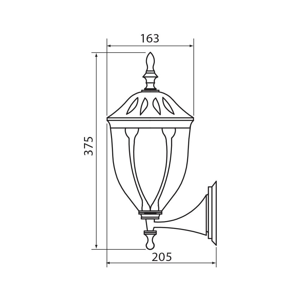 Фенер, алуминиев корпус, цвят черен, стъклени стени, шестстенен, с долен носач, фасунга E27, степен на защита IP44. Максималното натоварване е 1 х 60W за лампи с нажежаема жичка.