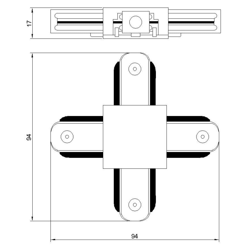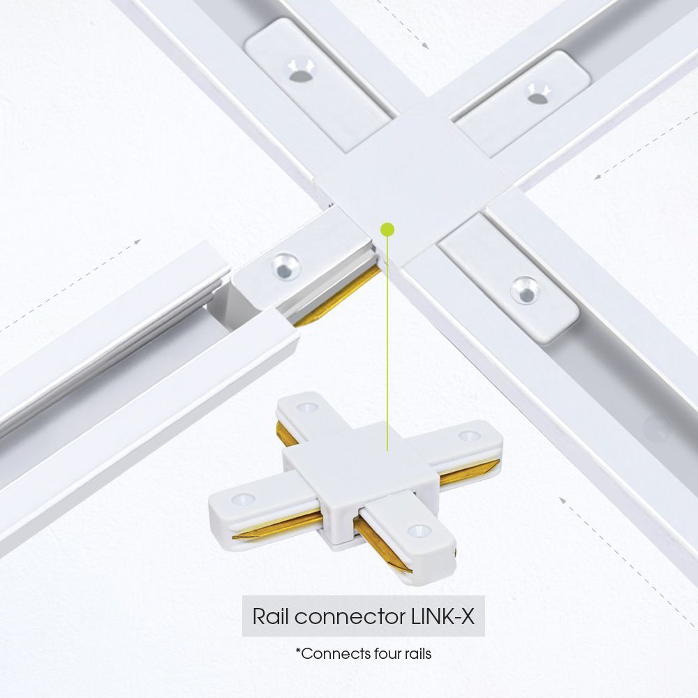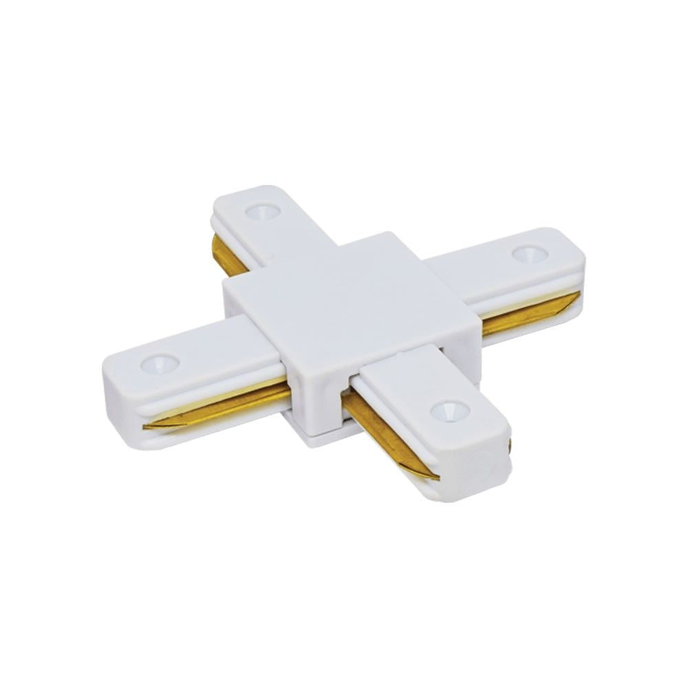 Х-конектор за релса, бял цвят. Решаването на осветлението с релсови осветителни системи следва Вашето въображение, а ние предлагаме аксесоарите, с които да осъществите идеята си - монтирайте избраните спотове или прожектори на релси с дължина 1 метър или 2 метра; свържете релсите с помощта на конекторите (I, L, T, X).