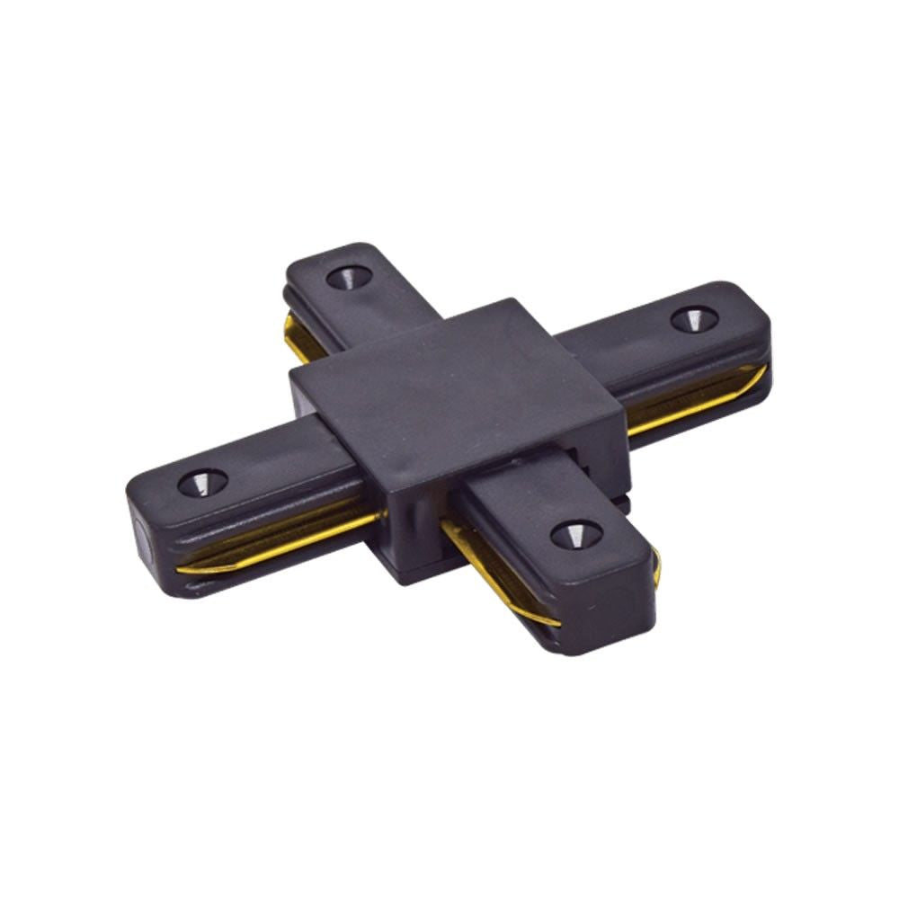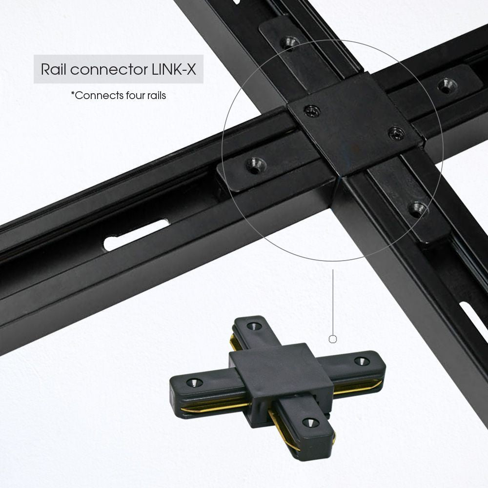 Х-конектор за релса, черен цвят. Решаването на осветлението с релсови осветителни системи следва Вашето въображение, а ние предлагаме аксесоарите, с които да осъществите идеята си - монтирайте избраните спотове или прожектори на релси с дължина 1 метър или 2 метра; свържете релсите с помощта на конекторите (I, L, T, X).