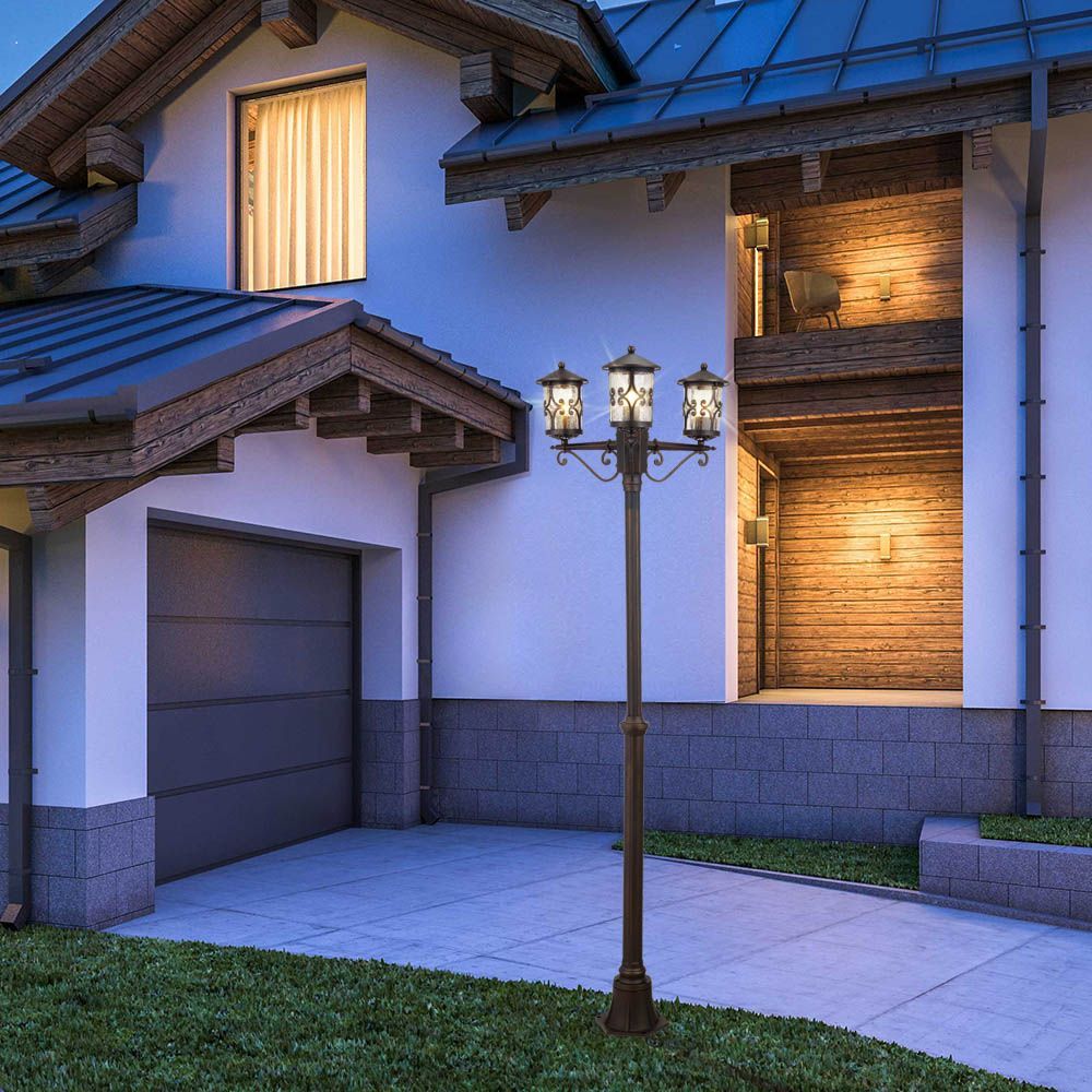 Троен фенер на стълб JARDIN, 230V, кафе. За монтаж върху земя в комплект със стълб, алуминиев цилиндричен корпус, декоративни стъкла с метален орнамент, фасунги E27, IP44. Максимално натоварване 1 х 60W. JARDIN са класически фенери в цвят кафе на кръглия алуминиев корпус с декоративни елементи и стъкло с начупен ефект. Фенерите са влагозащитени с IP44 и са подходящи за монтаж на открито.