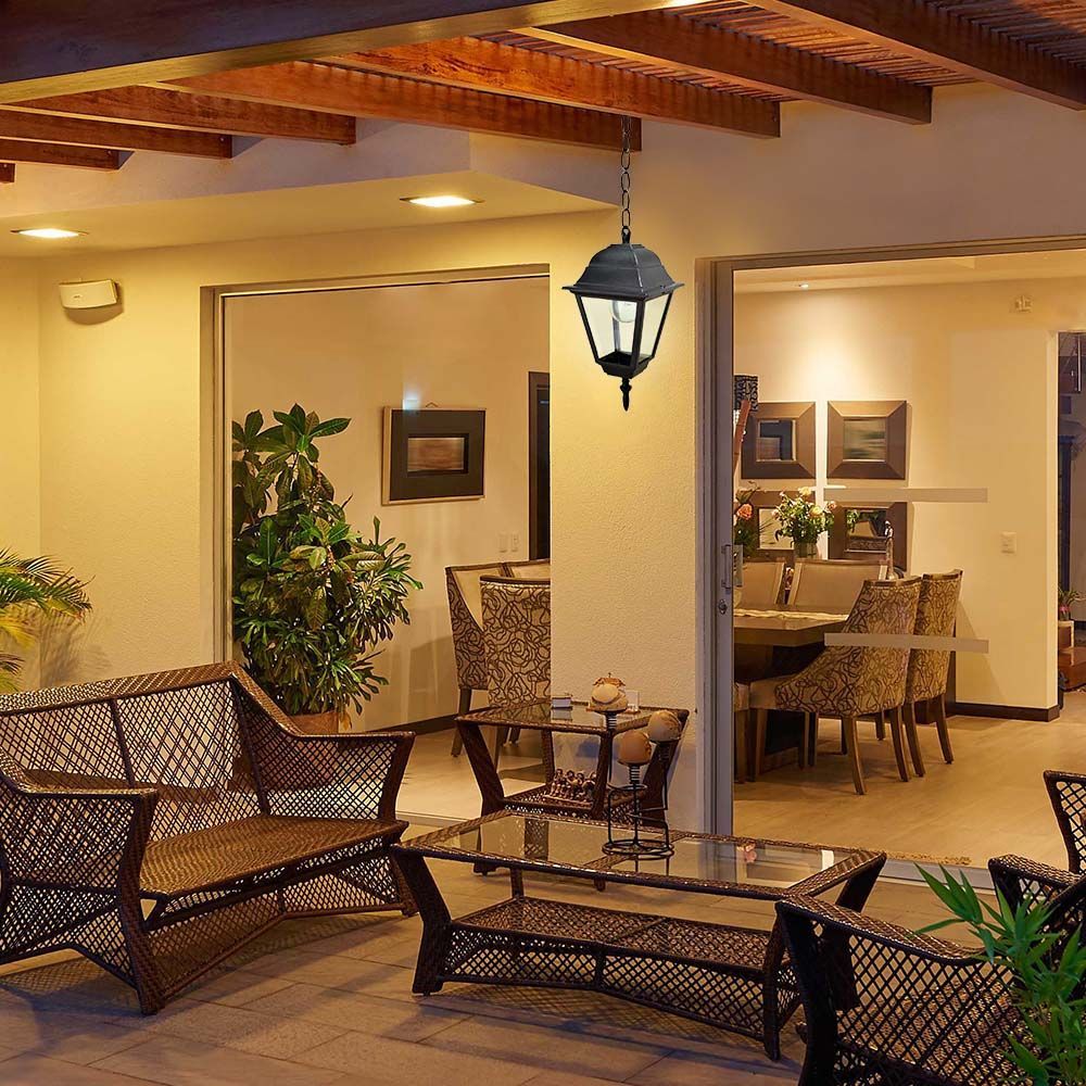 Фенер с класическа четиристенна форма, алумниев корпус, черен цвят, стъклени стени, за окачване върху таван, в комплект с пендел, фасунга E27, степен на защита IP44, общата дължина на тялото е 1150 мм. Максималното натоварване е 1 х 60W за лампи с нажежаема жичка.