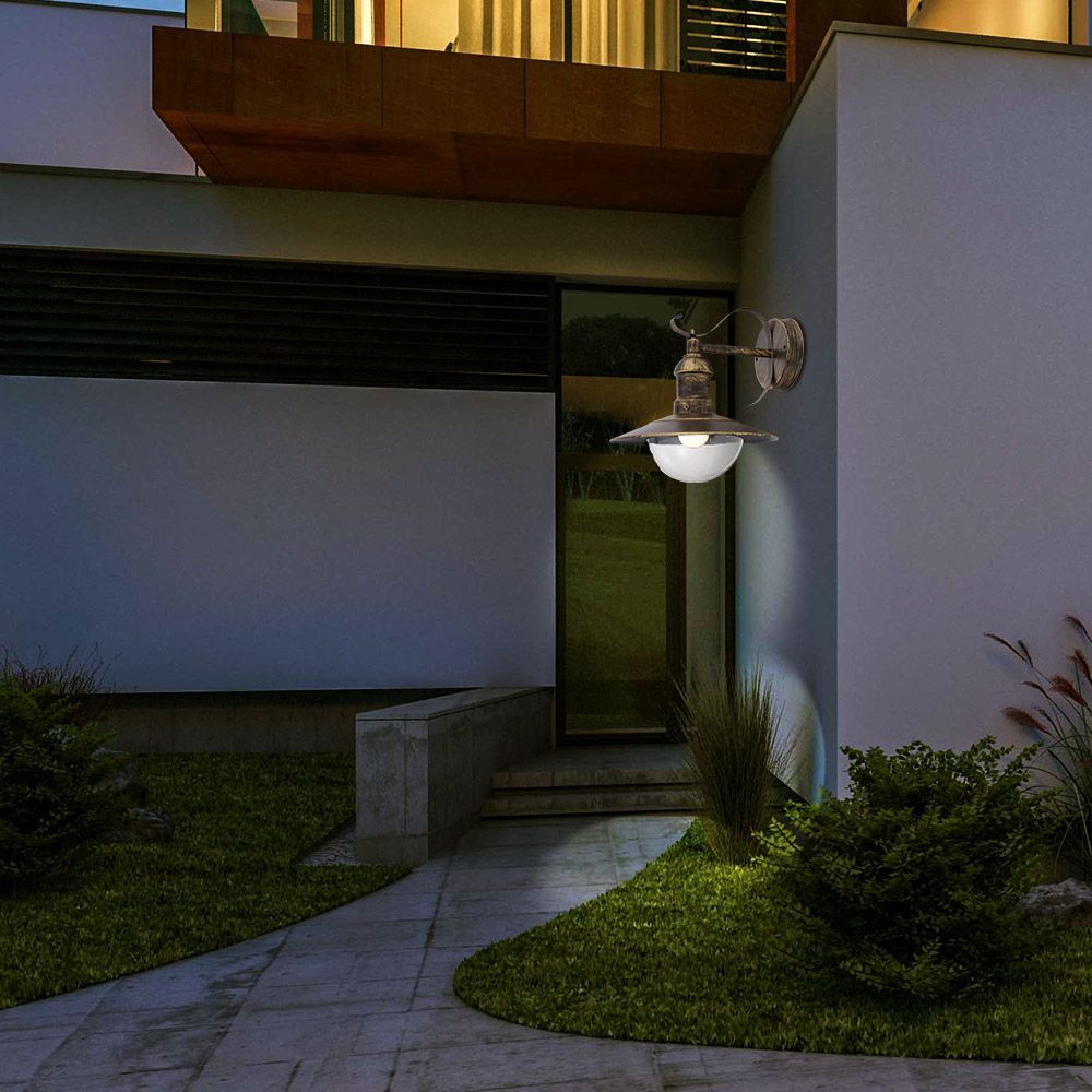 Стенен фенер RIVIERA с горен носач, WD010/AB, 230V, античен месинг. Серията фенери RIVIERA са с дизайн в средиземноморски стил и се предлага в три цвята на корпуса: бяло със злато, тъмносиво и античен месинг. Моделите в серията са с възможност за монтаж на стена или за окачване и са съвместими с лампи с цокъл Е27.