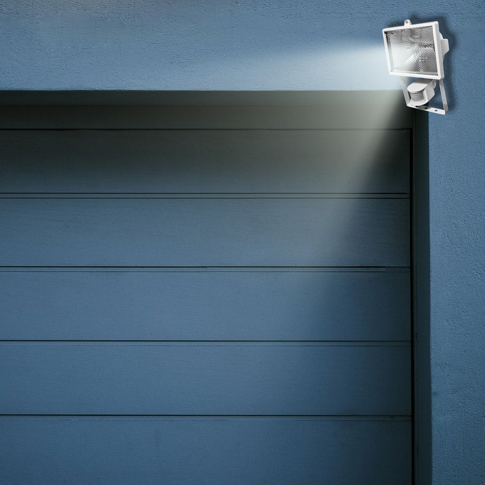 Халогенен прожектор със сензор, max 500W, 230V, бял. Степен на прахо- и влагозащита IP44. Подходящ за вътрешно и външно осветление.