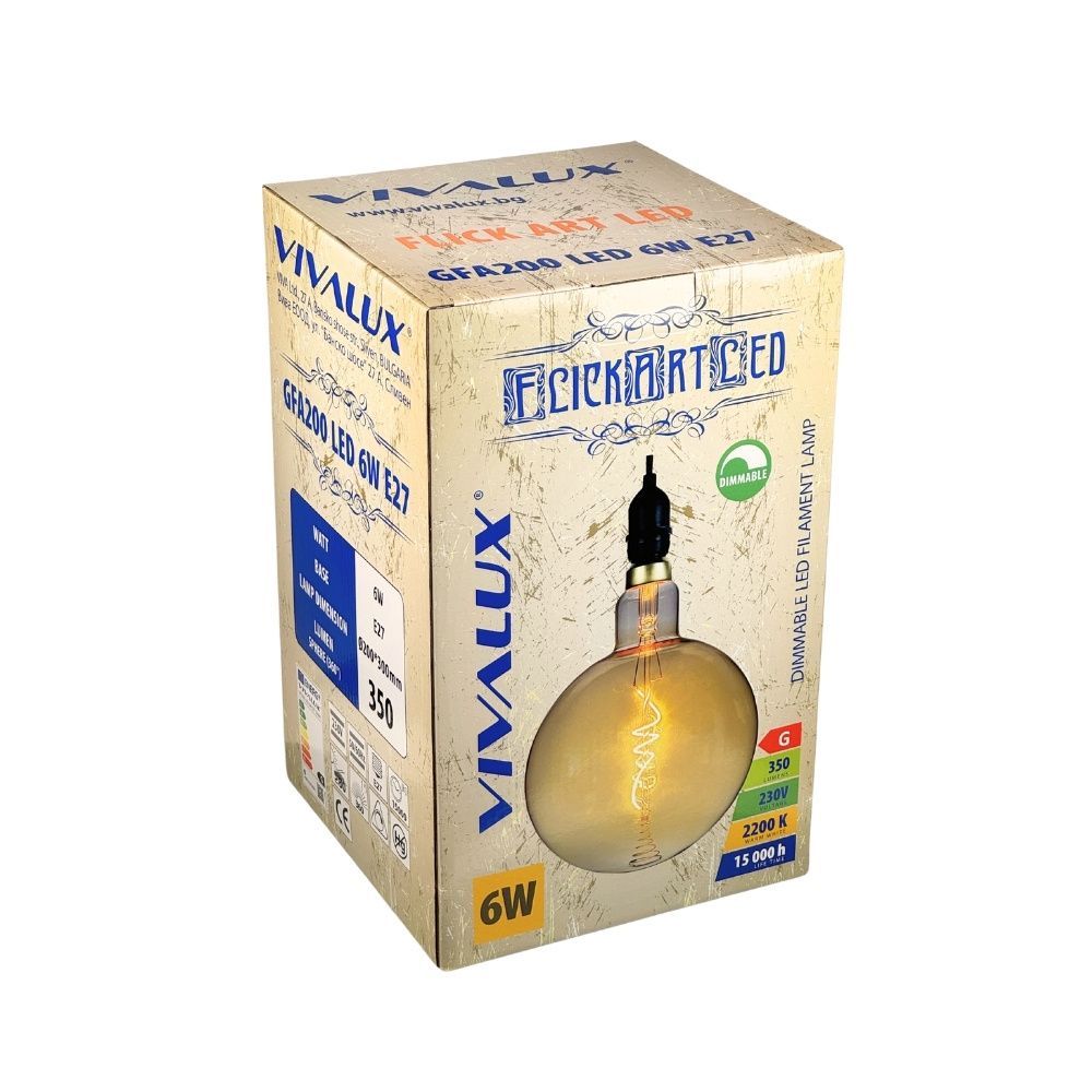 LED филамент лампа, 6W, 350 lm, 2200K, E27, Ø200 x 300 mm, 360°, 25 000 ч. Серията FLICK ART LED включва винтидж стил лампи с голям размер. FLICK ART LED са с гъвкави филаменти и допълнително оцветени колби в кехлибар, което създава интересен декоративен ефект.