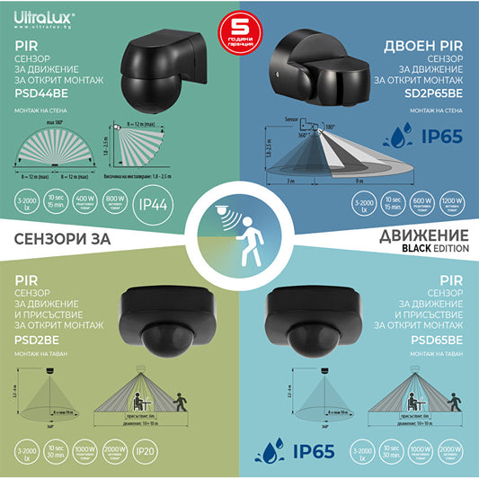 PIR сензор за движение и присъствие за открит монтаж с черна леща, 360°, 10m, IP65, черен / PSD65BE